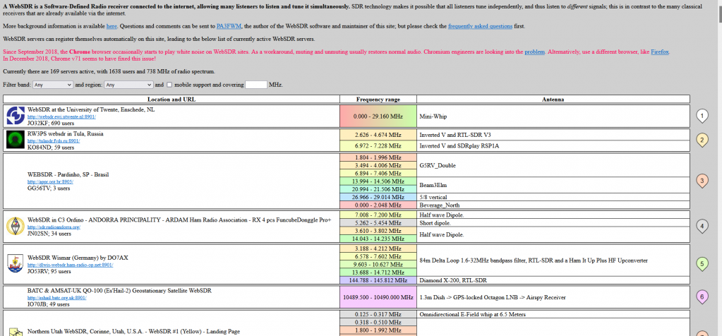 Auf der Webseite http://www.websdr.org/ kann man alle weltweit aktiven WEB-SDR Empfänger aufrufen und auf verschieden Frequenzen Stationen empfangen.